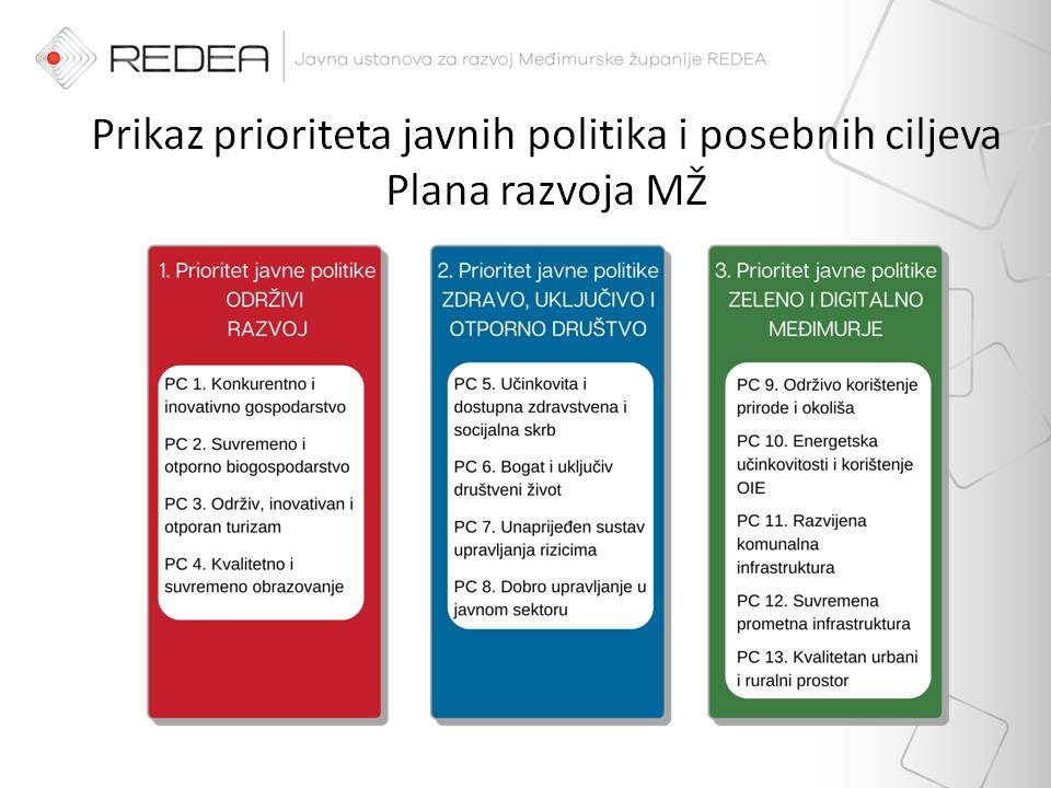 Sam Plan razvoja razradila je Javna ustanova za razvoj Međimurske županije REDEA čija je ravnateljica Sandra Polanec Marinović istaknula 3 glavna prioriteta i 13 posebnih ciljeva. Prvi prioritet je održivo gospodarstvo, drugi zdravo, uključivo i otporno društvo, dok je treći prioritet zeleno i digitalno Međimurje.